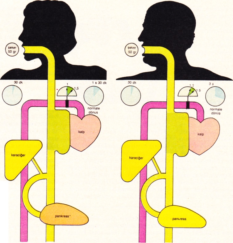 Bir kişi 50 gr şeker aldığında, kandaki şeker oranı (glisemi) 30 dakika içinde, litre başına 1 gr’dan 1,5 gr’a ulaşır; genç bir erişkinde, bu oran 90 dakika içinde normal hale gelir. Bir yaşlıdaysa, kandaki şeker oranının, litre başına 1,2 gr olabilmesi için 5 saat gerekir. Yaşlılığın ayrıca kötü koşullar altında ruhsal çöküntülere yol açtığı da bilinen bir gerçektir.
