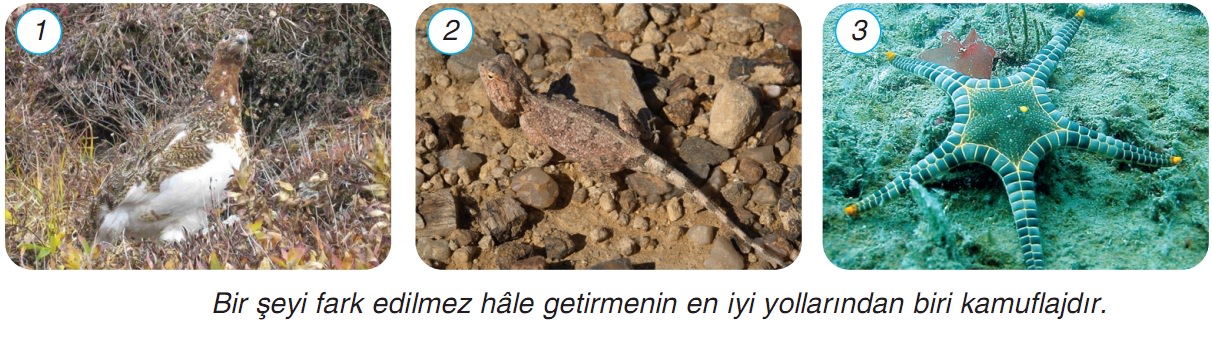 1. Birinci fotoğraftaki kekliği, ikinci fotoğraftaki bukalemunu, üçüncü fotoğraftaki denizyıldızını kolayca fark edebildiniz mi? Neden?