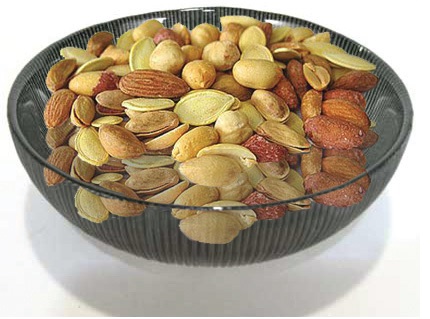 Çerez kasesinde, fıstık, badem, kabak çekirdeği gibi çerezler heterojen şekilde dağılmışlardır.