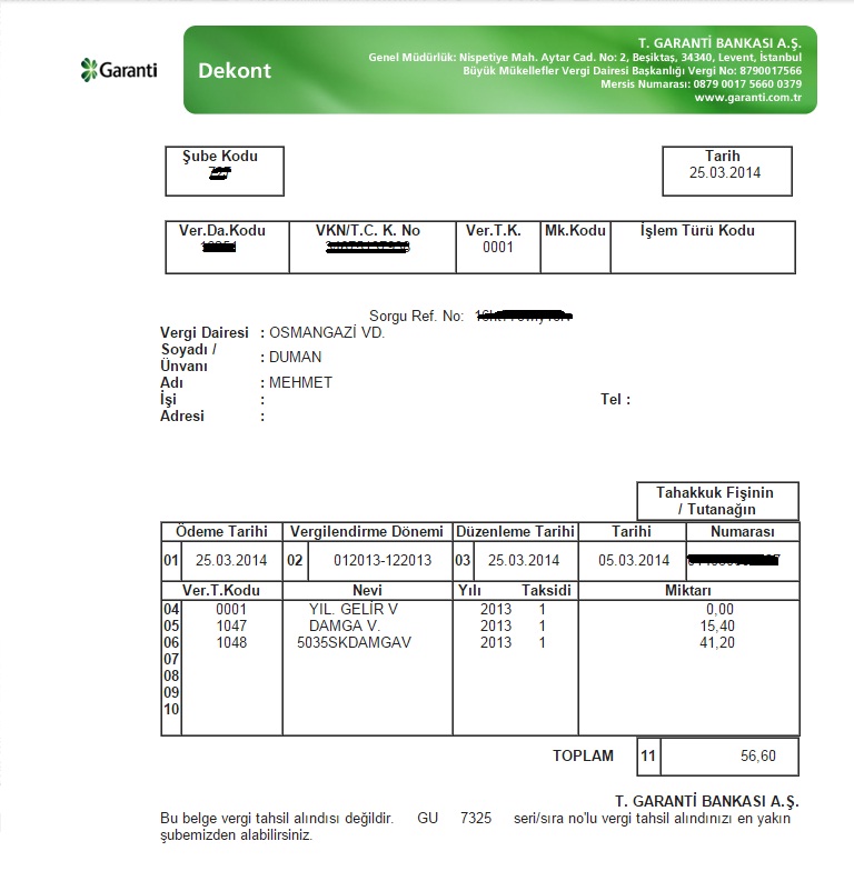 Yukarıda resimde bir tane vergi ödeme belgesi bulunmaktadır. Bunu incelediğimizde, karalı yerler ödeyen kişinin kişisel bilgileridir ki bunları bilmememize gerek yok, alt bölümde hangi vergilerin olduğu görülmekte, bu belge ile kişi, yıllık gelir vergisi ve damga vergisi ödemiştir. Bu ödemeyi banka yoluyla yaptığı da belge üzerinden anlaşılmaktadır.