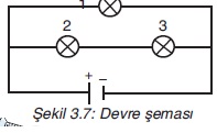 Yanda özdeş üç ampul, pil ve bağlantı kablolarıyla kurulmuş bir devre şeması verilmiştir (Şekil 3.7). Şemadaki numaralandırılmış ampullerden hangileri seri, hangileri paralel bağlanmıştır? Bu şekilde seri ve paralel bağlı ampullerin bir arada bulunması durumunda ampullerin parlaklıkları ve dirençlerinde nasıl bir değişiklik olur? Sorunun cevabını bulmak için aşağıdaki etkinliği yapınız: