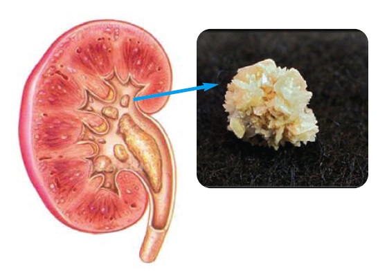 Kandan süzülen kalsiyum ve azot gibi bazı minerallerin oluşturduğu, suda çözünmeyen tuz kristalleri birbirine yapışarak büyür ve böbrek taşlarını oluşturur. Bu taşlar zamanla daha da büyüyerek tıkanıklıklara neden olur ve çok şiddetli ağrı hissedilir.