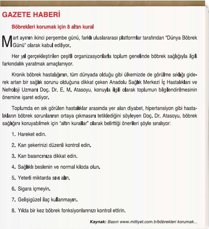 Yukarıdaki gazete haberinden ve araştırma sonuçlarınızdan yararlanarak boşaltım sisteminin sağlığını korumak için neler yapılması gerektiğini sınıfta arkadaşlarınızla tartışınız.