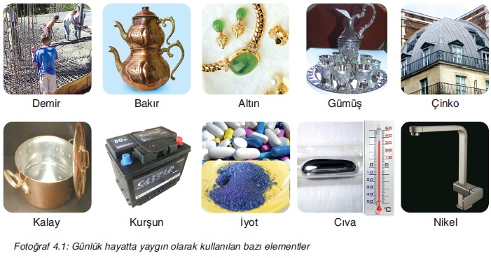 İlk 20 element içinde yer almayan ancak günlük hayatta yaygın olarak kullanılan birçok element vardır. Periyodik tabloda farklı sıralarda yer alan bu elementlerden bazıları, günlük hayatta yaygın olarak kullandığımız biçimleriyle Fotoğraf 4.1’de verilmiştir. Bu elementleri ve kullanıldıkları yerleri fotoğraflardan yararlanarak defterlerinize yazınız.