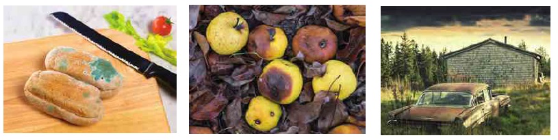 Kimyasal değişim sonucu yeni bir madde oluştuğu için maddeler fiziksel yollarla eski hâline dönüştürülemez. Yukarıda 3 tane örnek görülmektedir. Küflenen ekmek, çürüyen elma ve paslanan araba.