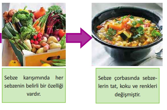 Değişik sebzeler kullanılarak yapılan bir sebze çorbasının tadı, kokusu ve rengi çorba yapımında kullanılan sebzelerden tamamen farklıdır. Sebzelerin doğranarak parçalanması fiziksel değişimdir. Fakat doğranan bu sebzelerden çorba yapılması kimyasal bir değişimdir.