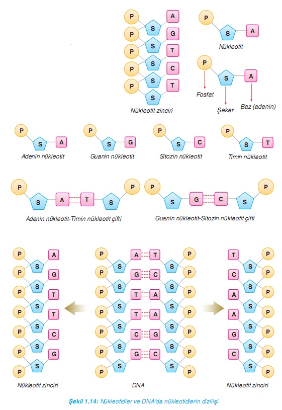 Bir nükleotit; bir şeker, bir fosfat ve bir bazdan oluşur. Nükleotitlerin yapısında bulunan şeker ve fosfatlar aynı