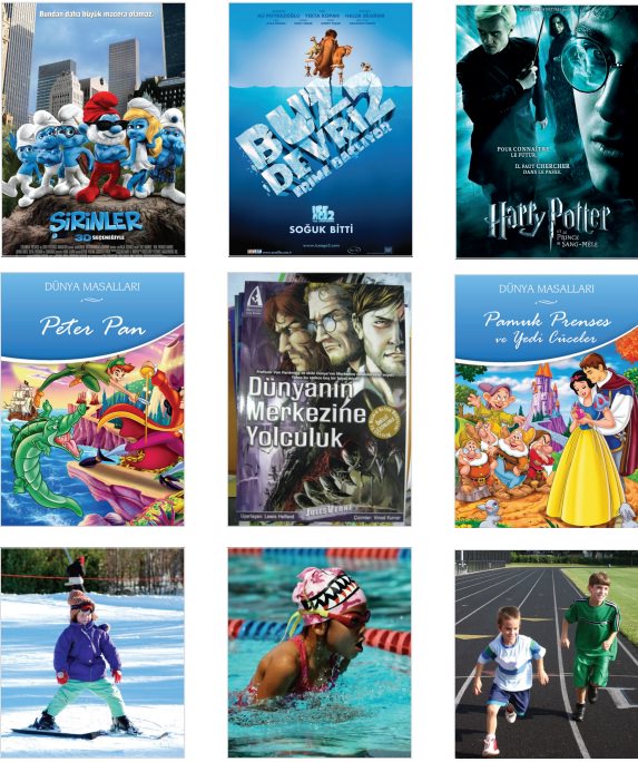 Dünya çocuklarının ortak ilgi alanlarında çizgi filmler ve sinema önemli bir yer tutar. Bütün çocuklar çizgi filmleri ve çocuklara yönelik sinemayı heyecanla ve severek izler. Aşağıda görülen Şirinler, Buz Devri ve Harry Potter (Heri Potır) gibi çizgi ve sinema filmleri dünya çocukları tarafından beğenilerek izlenmektedir. Bu yüzden birçok dile çevrilmiştir.