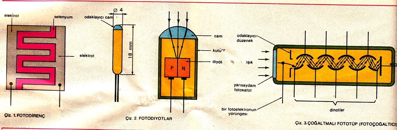 Bir cam yüzeyinin odakladığı bir ışık demetinin aydınlattığı bağlantılı (jonksiyon) diyotlardır (Çiz.2). Bir fotodiyot, “ters” yönde kutuplanacak biçimde devreye yerleştirilir. Karanlıkta sıfır olan ters akım, alınan ışık akışıyla artar. Bir fotodiyotun duyarlılığı, görünür frekanslarla morötesi ve kızılötesini de içeren birband için 30 mA/Lm’e erişebilir. Çok küçük hacimli olan fotodiyotlardelikli şeritlerin okunması ve sayılmasında çok kullanılırlar.