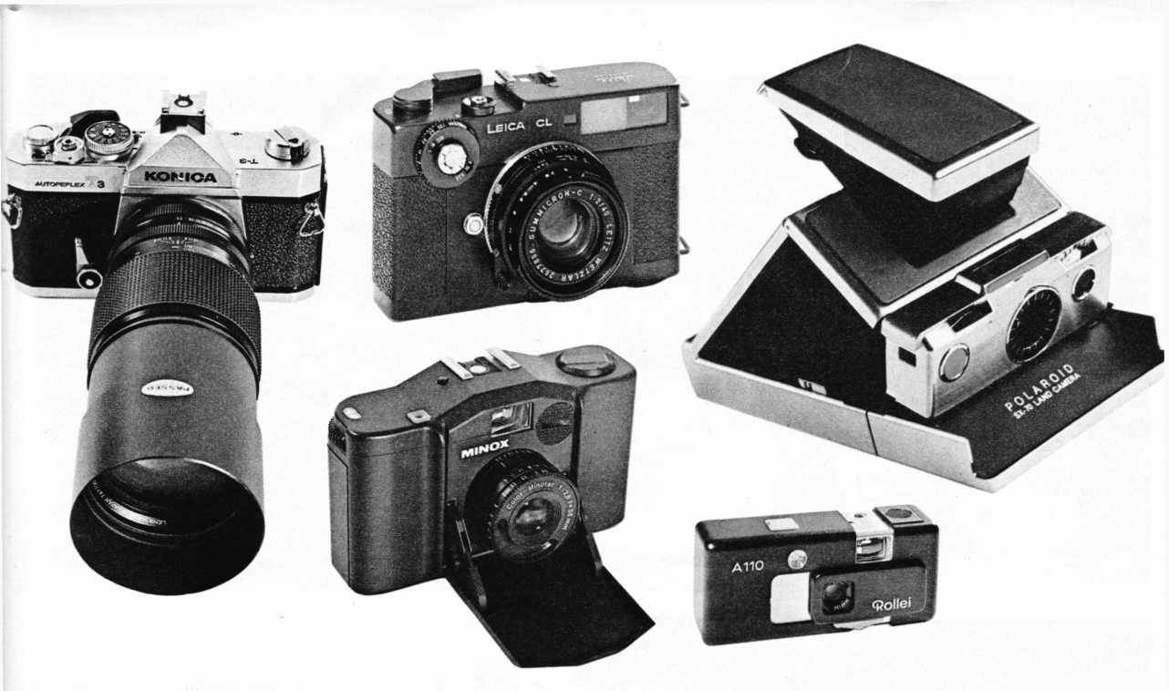 Soldan sağa 200 mm’lik teleobjektifli Konica T 3(24×36); Leica CL; Minox 35 EL (24×36); Rollei A 110 (28×28); Polaroit 70.