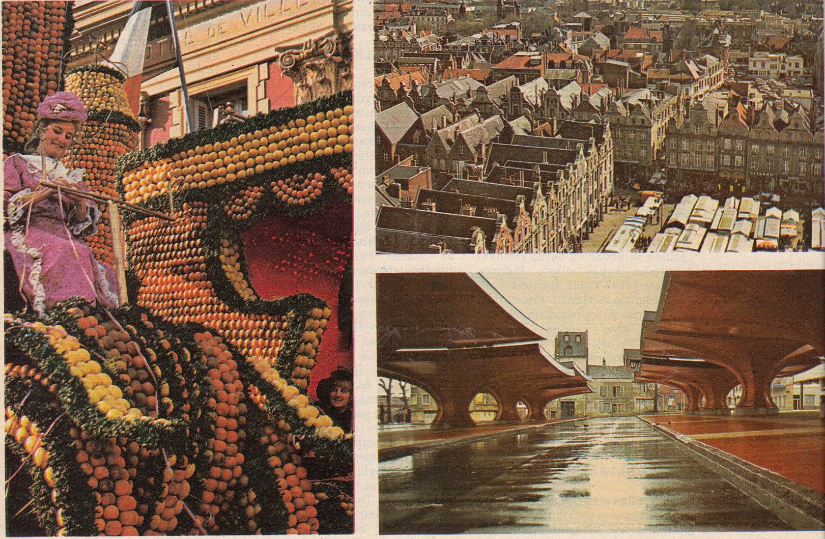 Altta, solda: Menton 'da limon şenliği. Ortada, sağda: Arras 'ta Heros alanındaki pazar yeri. XVII. ve XVIII. yy'dan kalma, Flaman üslubundaki evler, 1914 bombardımanlarından sonra eskiye uygun olarak onarıldı. Altta,sağda: Orleans 'da Marche alanındaki, XVI. yy'dan kalma eski evler ve modem hal binası.