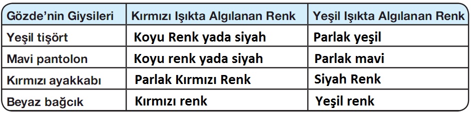 Gözde, yeşil tişört, mavi pantolon ve beyaz bağcıklı kırmızı ayakkabı giyerek bir partiye katılıyor. Partinin yapıldığı salonun oturma alanı yeşil, dans pisti ise kırmızı ışıkla aydınlatılıyor. Gözde’nin üzerindeki giysilerin dans pistinde ve oturma alanında algılanan renklerini defterimizde oluşturduğumuz aşağıdaki gibi bir çizelgeye yazalım.