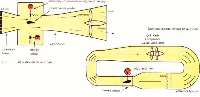 Fransız mühendisi Gustave Eiffel (1832-1923) tarafından tasarlanmış olan ilk hava tünelleri açık devrelidir. Bu hava tünellerinin içindeki hava akımını, tünelin çıkışına yerleştirilmiş olan pervaneli vantilatörler yaratır (Çiz. 1). 1930’da Caquot’nun bu ilkeye dayanarak yaptığı Chalais-Meudon hava tünelinin kesiti 8 m’ye 16 m’dir; bu, büyük boyutlu maket deneylerinin gerçekleşmesini sağlar. Günümüzde daha çok, ilkini Alman aerodinamikçisi Ludvvig Prandtl’ın (1875-1953) yaptığı, dönüşlü hava tünelleri kullanılmaktadır. Bu hava tünelleri, kapalı devre olarak çalışırlar; vantilatörlerin ya da kompresörlerin çektiği hava, tünelin içi’nde dolanır (Çiz. 2). Deneme bölgesinin girişinde, yakınsak bir boru, akış hızım artırmaya yarar. Deneme bölgesiyle vantilatörlerin arasında bulunan ıraksak bir yayındırıcı, maketin alt bölümündeki basıncı azaltır; bu da akış hızında bir artışa yol açar. Ama akış hızı ses hızını geçmez. Demek ki, bu tür hava tünelleri, sesaltı hızların incelenmesinde kullanılmazlar. Bunların, açık devreli hava tünellerine oranla başlıca üstünlüğü, daha yüksek hızlara olanak vermeleri ve havadan başka akışkanlardan da yararlanabilmeleridir.