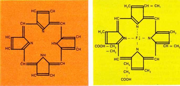 Kimyasal yapısı, porfirinik çekirdek denilen bir tetrapirol oluşturmak için dört pirol çekirdeğinin bir araya gelmesine denk düşer. Bu çekirdeğin Fe2+ ya da Fe3+ halindeki bir demir atomunu bağlama özelliği vardır. Globine kolay yükseltgenme niteliğini sağlayan, bu demirli (II) çekirdektir. Hemoglobinin her bir demir atomu, HB + 02^HB 02 tersinir tepkimesini izleyerek bir oksijen molekülü bağlayabilmektedir. Bu tepkimeyle oluşan oksihemoglobin, canlı kırmızı renkte, kararsız bir bileşiktir.
