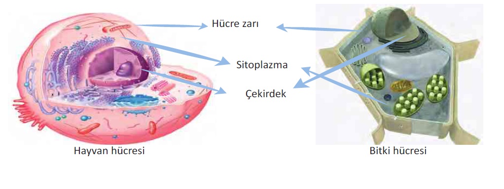 Gelişmiş bir hücre üç temel kısımdan oluşur. Bunlar; hücre zarı, sitoplazma ve çekirdektir. Bakteri gibi gelişmemiş hücrelerin ise çekirdekleri yoktur.