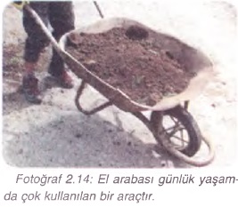 Yanda bir el arabası fotoğrafı görmektesiniz (Fotoğraf 2.14). El arabası, inşaatlarda, bahçe işlerinde, ev işlerinde malzeme, toprak veya eşya taşımak için kullanılır. El arabasının
