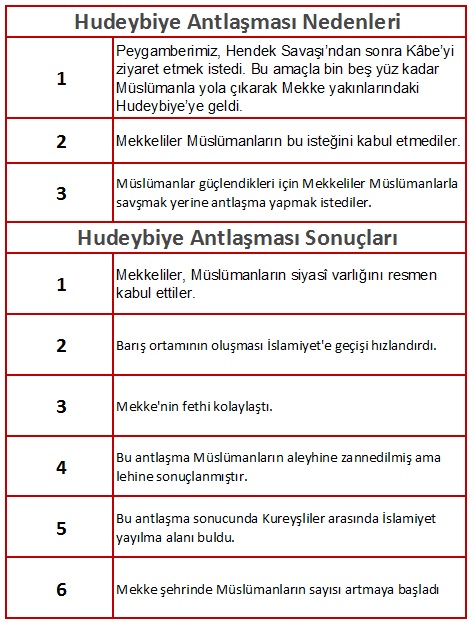 Hudeybiye Antlaşması’nın neden ve sonuçlarını şema halinde gösteriniz. Peygamberimiz, Hendek Savaşı’ndan sonra Kâbe’yi ziyaret etmek istedi. Bu amaçla bin beş yüz kadar Müslümanla yola çıkarak Mekke yakınlarındaki Hudeybiye’ye geldi. Mekke’ye bir elçi göndererek amacının sadece Kâbe’yi ziyaret etmek olduğunu bildirdi. Ancak Mekkeliler Müslümanların bu isteğini kabul etmediler. Taraflar arasında yapılan görüşmelerden sonra 628 yılında “Hudeybiye Antlaşması” […]