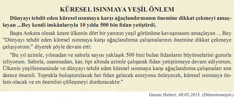 Aşağıdaki gazete haberini okuyunuz. Haberdeki faaliyetin doğaya ve canlılara yaptığı etkileri tartışınız. Küresel Isınmaya Yeşil Önlem Dünyayı tehdit eden küresel ısınmaya karşı ağaçlandırmanın önemine dikkat çekmeyi amaçlayan …Bey kendi imkanlarıyla 10 yılda 500 bin fidan yetiştirdi. Başta Ankara olmak üzere ülkenin dört bir yanının yeşil görünüme kavuşmasını amaçlayan … Bey “Dünyayı tehdit eden küresel ısınmaya karşı […]