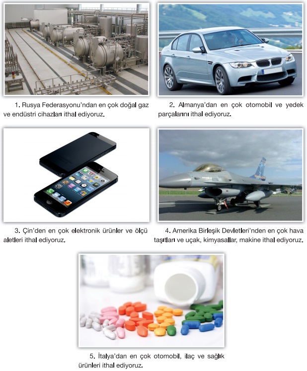Aşağıda ülkemizin 2012 yılı verilerine göre en çok ithalat yaptığı ilk beş ülke ve ithal ettiği ürünler gösterilmiştir. Bunları inceleyerek ülkemizin diğer ülkelerle olan ithalatını, ülkelerin kaynakları ve ülkemizin ihtiyaçları açısından değerlendiriniz. 1. Rusya Federasyonu’ndan en çok doğal gaz ve endüstri cihazları ithal ediyoruz. 2. Almanya’dan en çok otomobil ve yedek parçalarını ithal ediyoruz. 3. Çin’den […]