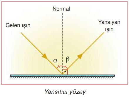 Gelen ışın, yansıyan ışın ve yüzeyin normali arasında nasıl bir ilişki vardır? Yansıma olayında gerçekleşen durumlar, Yansıma Kanunları ile ifade edilmektedir. yansıma kanunlarına göre; 1. Gelen ışın, yansıyan ışın ve yüzeyin normali aynı düzlemdedir. 2. Yüzeye normal doğrultusunda gelen ışın, kendi üzerinden geri yansır. 3. Gelme açısı yansıma açısına eşittir.