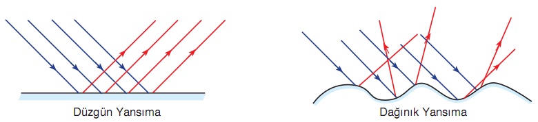 Işık hangi yüzeylerden yansıyabilir? Işık bütün yüzeylerden yansıyabilir. Işık madde ile karşılaştığında birçok şekilde etkileşir. Yansıma bunlardan biridir. Işığın yansıtıcı bir yüzeye çarparak yön değiştirmesi ve geldiği ortama geri dönmesi olayına yansıma denir. Yansıma olayında ışığın sadece yönü değişir, ışığın renginde ve süratinde bir değişiklik olmaz. Maddenin yüzeyine göre yansıma farklılaşmaktadır.