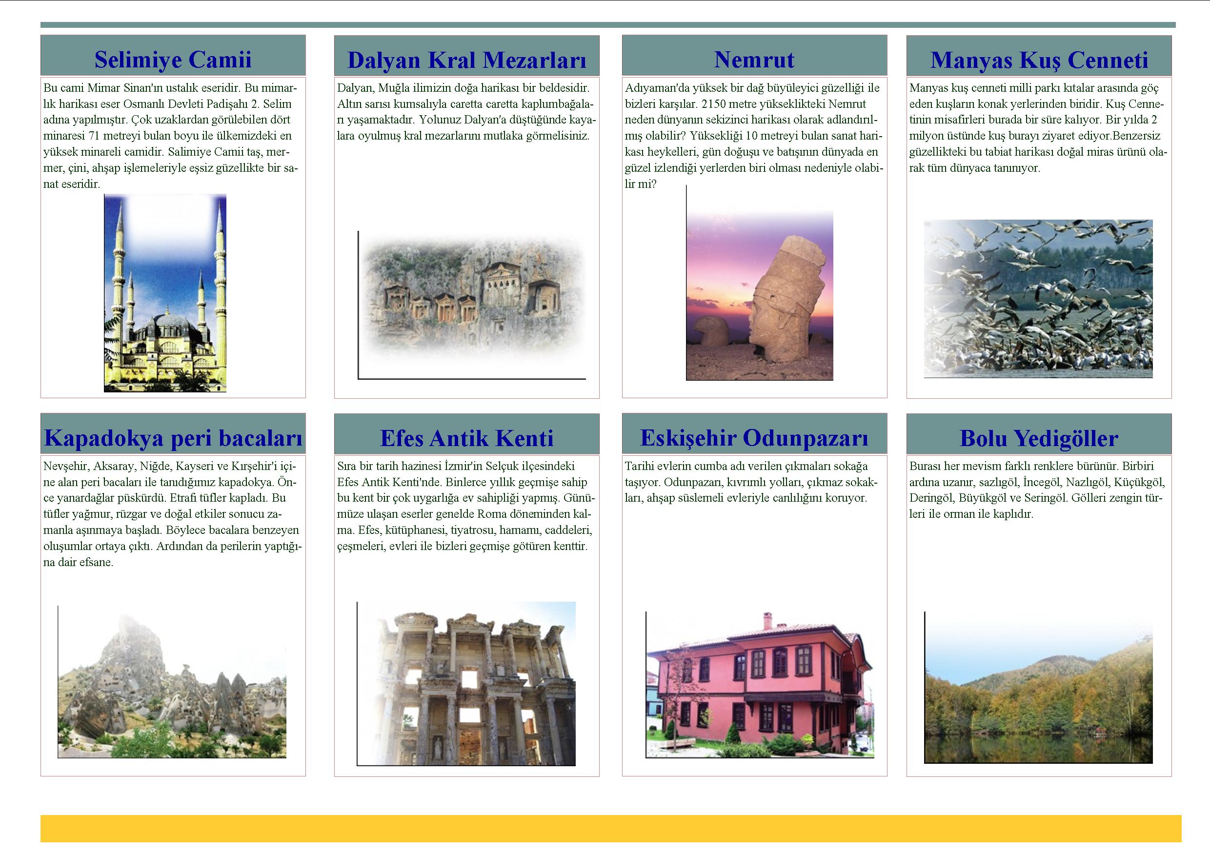 Arkadaşlarınızla birlikte ülkemizdeki doğal varlık, tarihi mekan, yapıt ve nesneleri tanıtan bir broşür hazırlayınız. Size yardımcı olmak için 2 yöntem izleyeceğim. Ben broşür hazırlayıp size bu sayfada size sunacağım. Birde bu sayfada yine resimleri ve metinleri de ekleyeceğim ki, belki kartona veya başka bir yere broşürünüzü yapmak istersiniz.